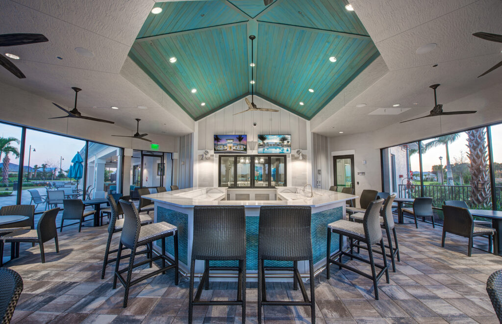 Our core market in the commercial segment is with homebuilders and developers, explains Natasha Ellis. This includes social buildings like clubhouses, fitness centers, and on-campus restaurants. We have also done some light commercial work in the retail and restaurant segments. From a budget standpoint, we can run anywhere from economical cabanas to exclusive high-end clubhouses. Typically, we are involved early in the design process where we can comment on the architectural design, helping to create a cohesive building start to finish for our client. We make all the selections on the building (interior and exterior) from typical finishes such as flooring, light fixtures, trims, and moldings to fine details such as grouts and transition strips; essentially everything attached to the building. Fieldstone A&E also provides furniture, art and accessory selections, budget development, procurement, installations, color blocking, 3D rendering and construction administration with value engineering. We can provide a full-scope service to our clients, which minimizes stress, cost, and the number of points of contact required.
