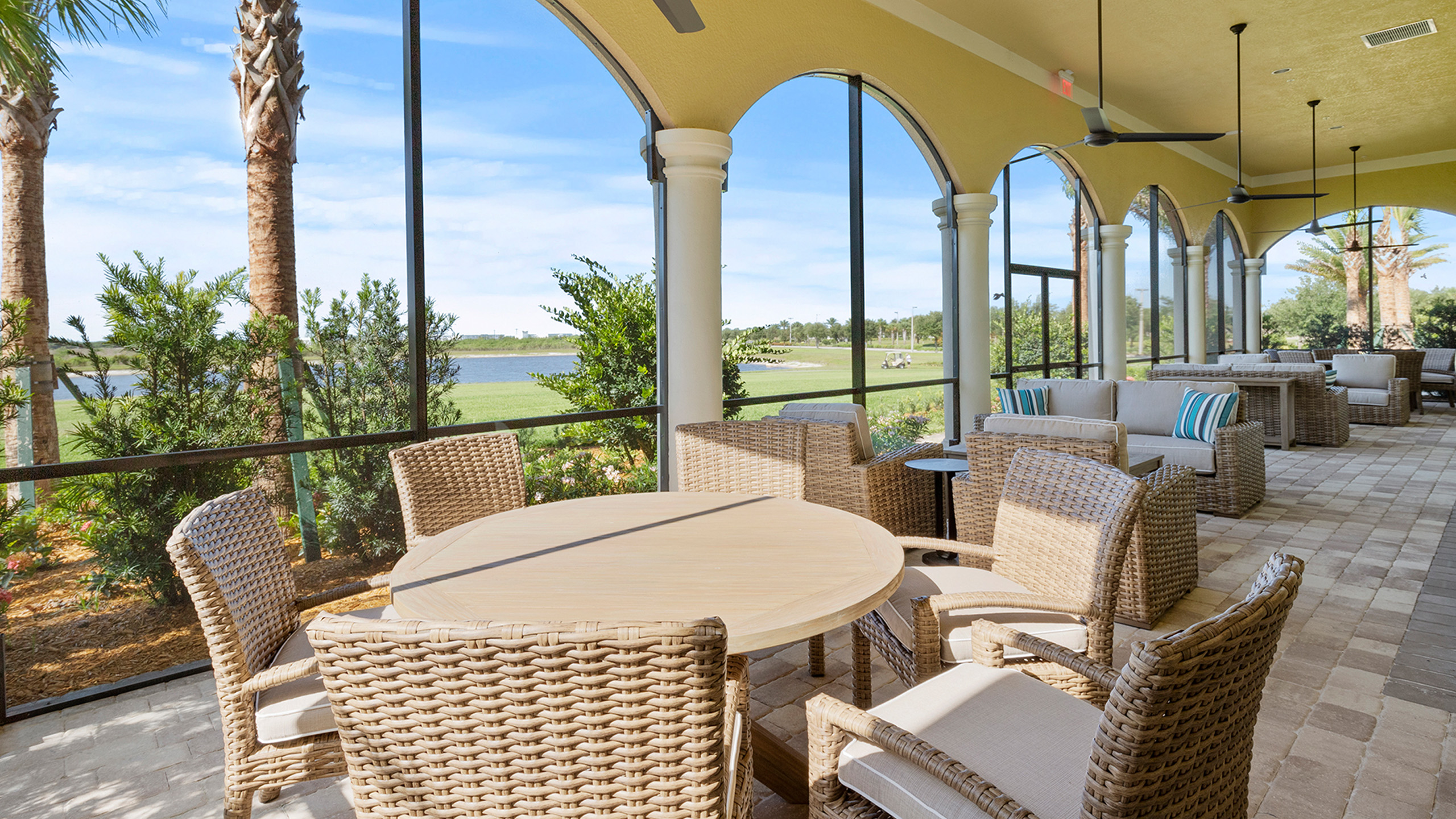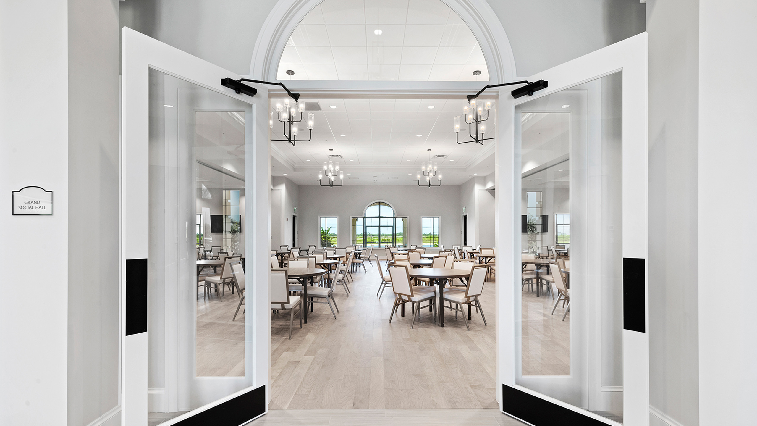 This is one of four buildings on the campus and serves as the main social/activity building. The building offers several card rooms, a game room with darts and billiards, a golf simulator, and a large ball/social room. The interior design boasts a more contemporary transitional feel.
