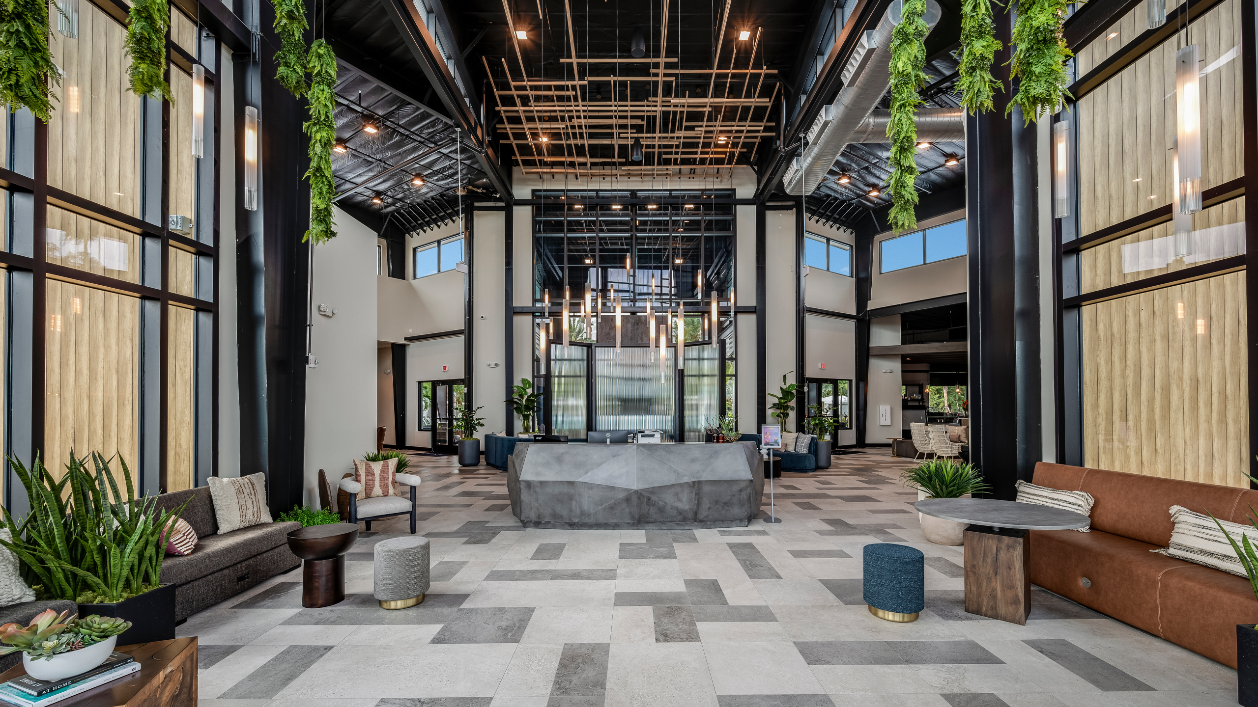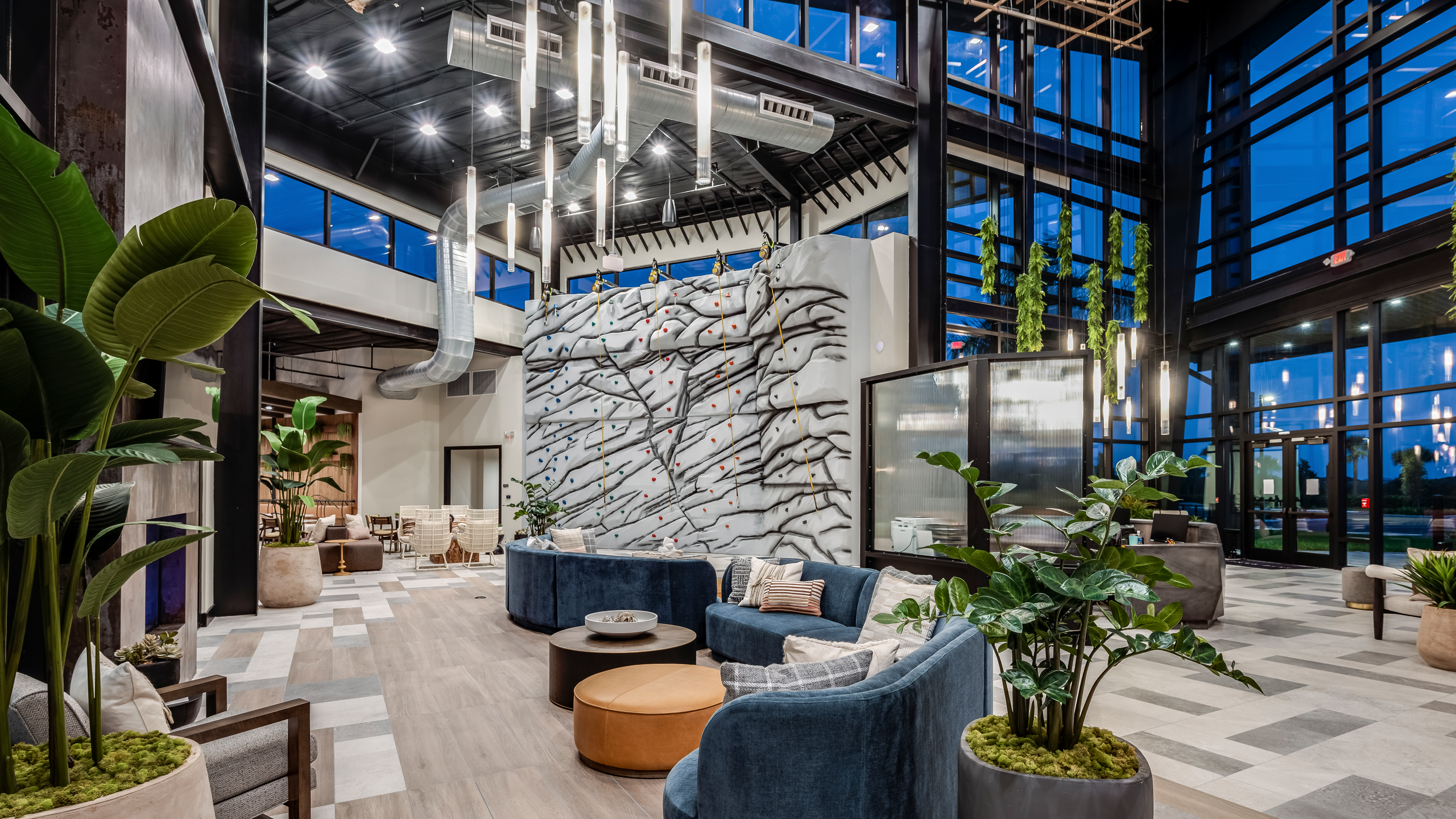 The Hub, with its sleek architectural elements, includes a glass curtain wall entry and insulated metal panels that mimic wood and tile. The Hub offers a resort-like experience that’s both stylish and functional. It offers a vibrant mix of fitness, recreation, and social spaces, including a full-size basketball court, rock climbing wall, gymnasium, movement studios, Kid Zone, and gathering areas, all within a striking 35’ atrium. With practical amenities like locker rooms, laundry, and a café, it delivers a stylish, resort-like experience tailored for active, community-focused living.