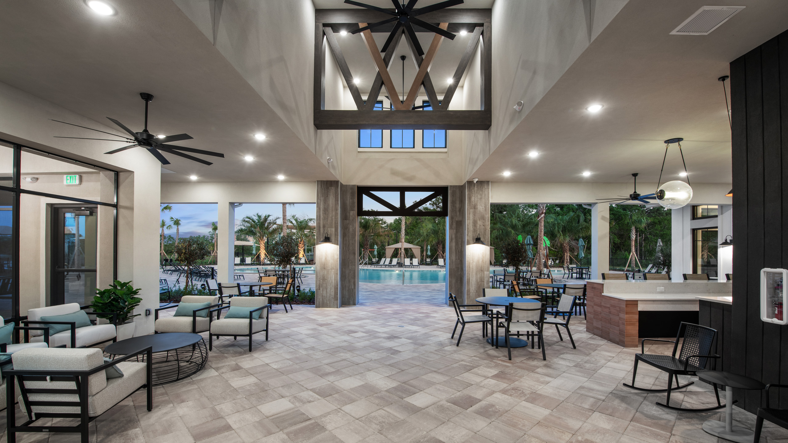 “The Clubhouse layout has distinct zones all connected by a common roof and breezeways,” Dan explains. “At the heart of the building is a large open-air covered family gathering space that flows seamlessly into covered verandas and the pool deck beyond. The individual spaces interact visually with all the other spaces, allowing family members to stay connected while enjoying different activities.”